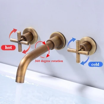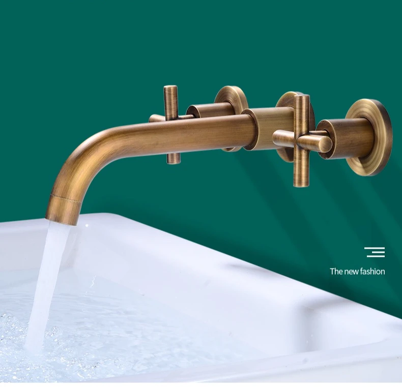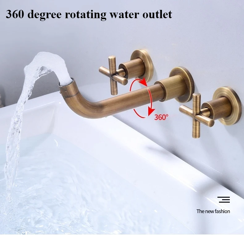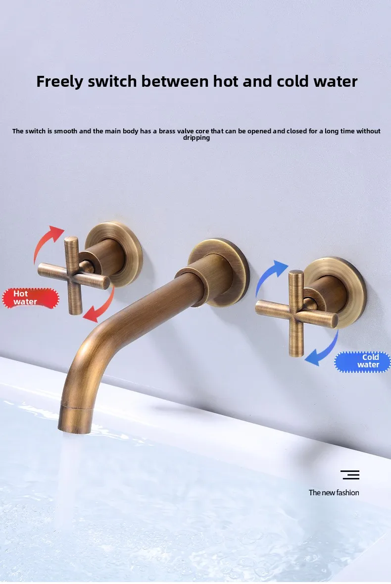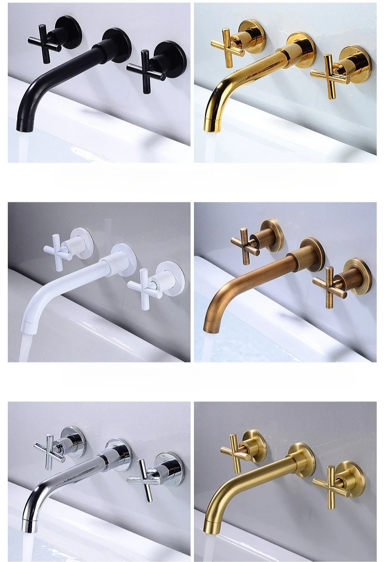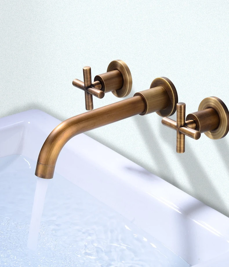 Wall Basin Faucet Set 3 Hole Gold/Black Gold Brass Double Cross Handle Wall Mounted Bathroom Basin Faucet Hot & Cold Tap